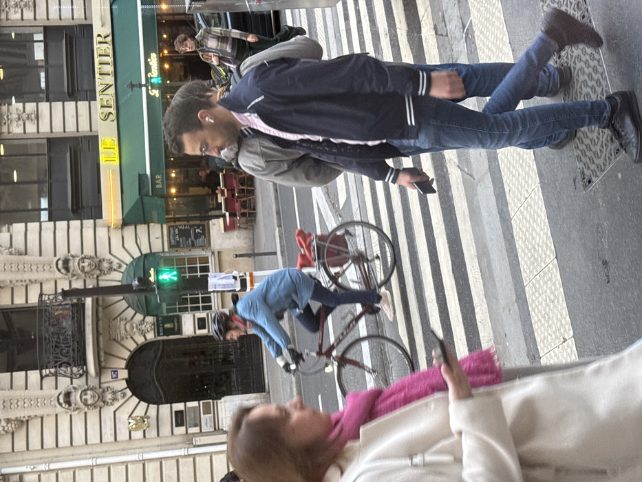 The image depicts a daytime street scene in the Sentier district of Paris, France, specifically at 87 Rue Montmartre. In the immediate foreground, left of center, a woman with brown hair, wearing a pink scarf and a cream-colored coat, is partially visible, holding a dark smartphone in her right hand. Mid-ground, a woman wearing a blue jacket and a black helmet cycles a red bicycle with a rear red basket across a white-striped pedestrian crosswalk, moving from left to right. A green pedestrian signal is visible on a pole to the right of the cyclist. Concurrently, a man with dark hair, glasses, and white wireless earbuds walks across the same crosswalk, moving rightward. He wears a navy blue bomber jacket with white striped cuffs over a light pink collared shirt, blue jeans, and black shoes, holding a dark smartphone in his left hand. A second person, largely obscured by this walking man, wears a grey jacket. In the background, a multi-story building exhibits ornate neoclassical architecture with sculpted faces (mascarons) and a wrought-iron balcony. The address number "87" is visible on the facade. Below this, a cafe named "LE SENTIER" is visible, featuring a green awning and "BAR" signage. Outdoor seating with red chairs and small tables is arranged in front of the cafe, and several patrons are visible inside through the windows. Further right in the background, a man with curly hair, dressed in a plaid shirt, stands next to a dark-colored vehicle.