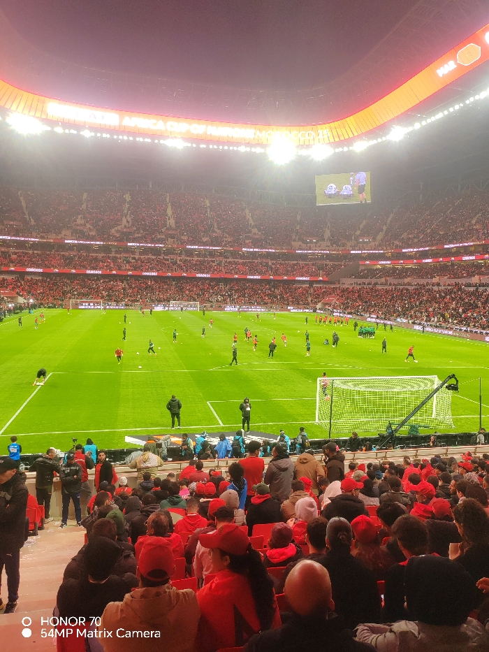 A vibrant soccer stadium is packed with fans, primarily wearing red. A match is in progress on the green field, and players in red and green uniforms are visible. A large screen hangs above the field, displaying content. The atmosphere is brightly lit, with the stadium’s interior illuminated by overhead lights. A goal net is visible in the foreground, with spectators seated behind it. The stadium appears to be filled to near-full capacity.