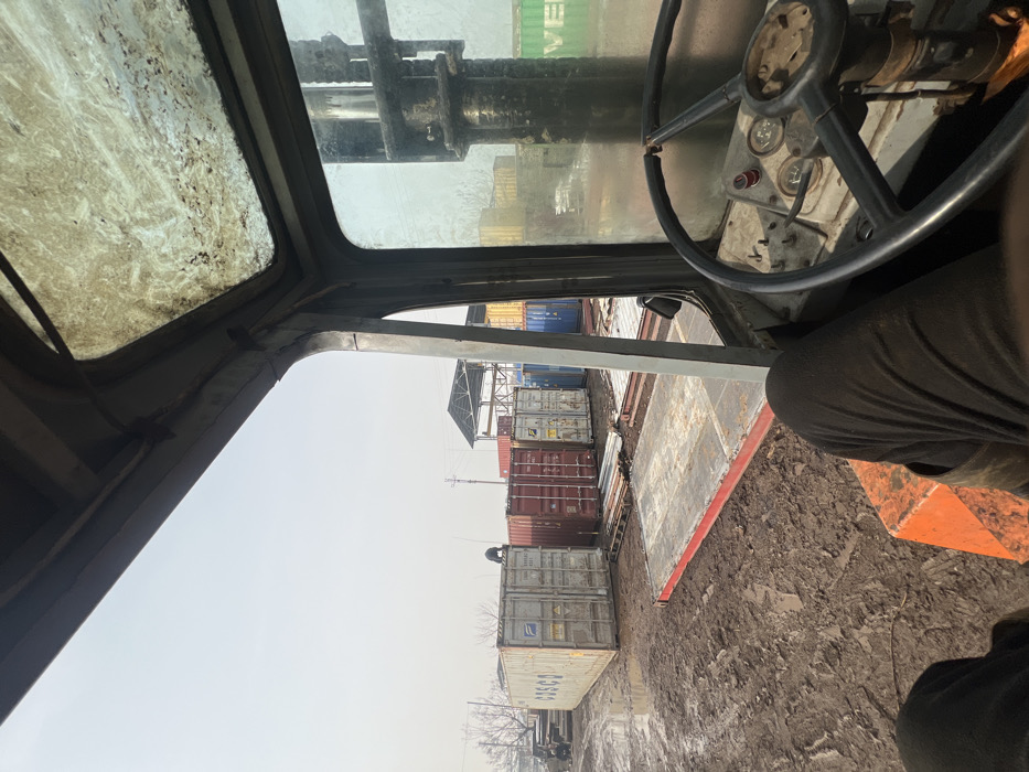 From within a vehicle, possibly a forklift, rows of stacked shipping containers are visible under a cloudy sky. The forklift's steering wheel and dirty cabin are in the foreground, with a person's legs also visible. The ground outside appears muddy.