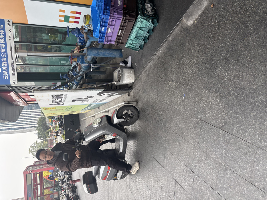 A man is riding a scooter on a sidewalk. The sidewalk is paved with gray rectangular stones. Behind him is a row of parked scooters and a red double-decker bus. Next to him is a large advertising sign and a building with Chinese characters. Above the sign are blue and purple plastic crates and a row of pipes.