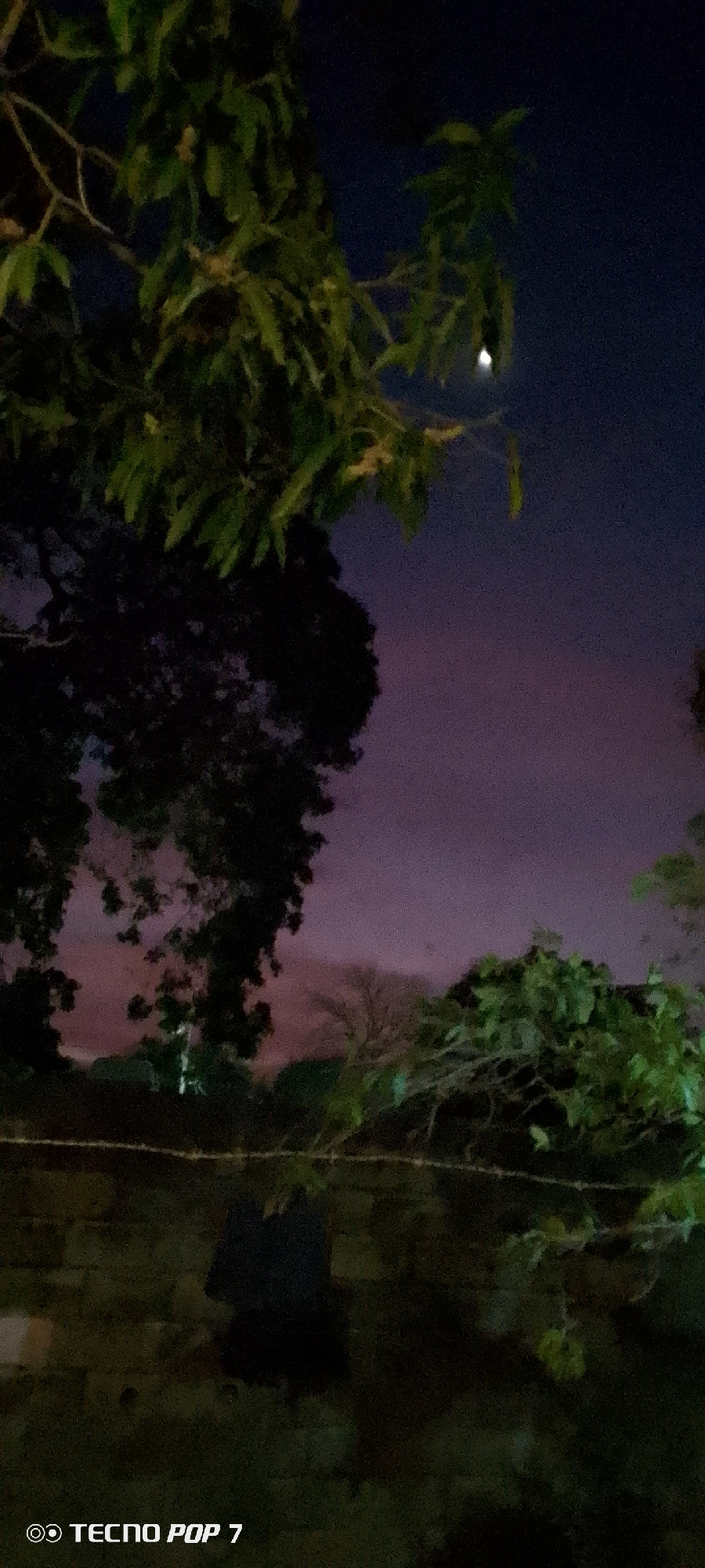 The image, taken with a TECNO POP 7 mobile phone, depicts a night scene in Altagracia, Venezuela. The sky transitions from deep blue at the top to shades of purple and pink near the horizon. A partial moon is visible in the upper right quadrant. Trees with dark green foliage are prominent in the foreground. The lower portion of the image shows a dark, textured wall. The scene is dimly lit.