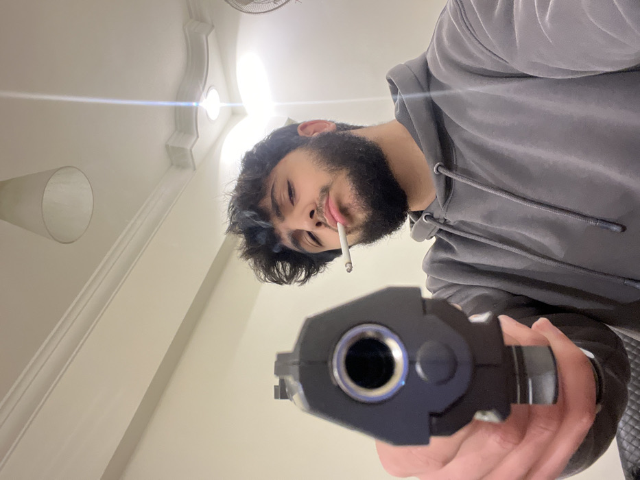 - "A man with a beard and a cigarette in his mouth points a handgun directly at the viewer" by FM-NiDCC3, licensed under CC BY 4.0