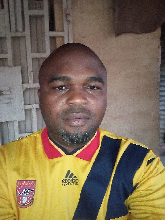 An adult Black male is depicted from the chest up, centered in the frame. He has a bald head, dark eyes, and a short, grey-flecked dark beard. He wears a yellow short-sleeved collared shirt with red trim on the collar. The shirt displays a reversed black "Adidas equipment" logo on the right chest and an Arsenal football club crest (featuring a cannon) on the left chest. Two prominent dark blue vertical stripes are visible on the right side of his shirt. The subject maintains a neutral expression, looking directly forward. Behind him, to the left, is a light-colored, possibly metal or wooden, structure with a grid pattern, resembling a door or window. To the right, a textured, light brown wall is present. The scene is located in Sabon Tasha, Nigeria.