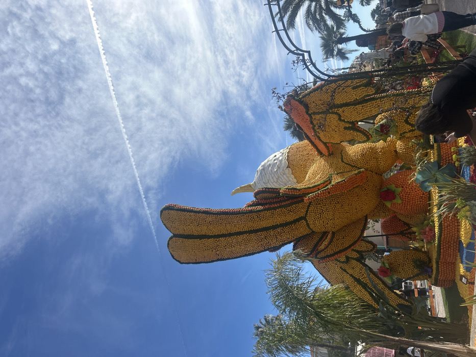 An outdoor scene in Menton, France, features a large, elaborate sculpture of an eagle, predominantly constructed from yellow lemons and smaller orange citrus fruits