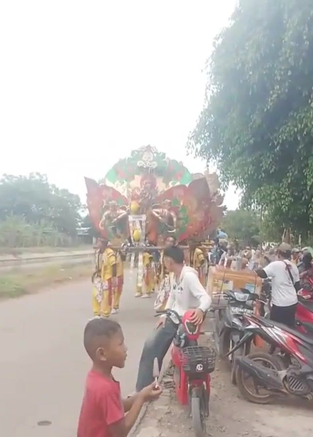 religious procession on a road. A group of people in yellow and orange robes are carrying a large, decorated palanquin. The palanquin has a colorful design with figures on it. A crowd of people is following the procession. There are parked motorcycles on the side of the road, and a boy in a red shirt is watching the procession while holding a stick. The sky is overcast, and trees line the roadside.
