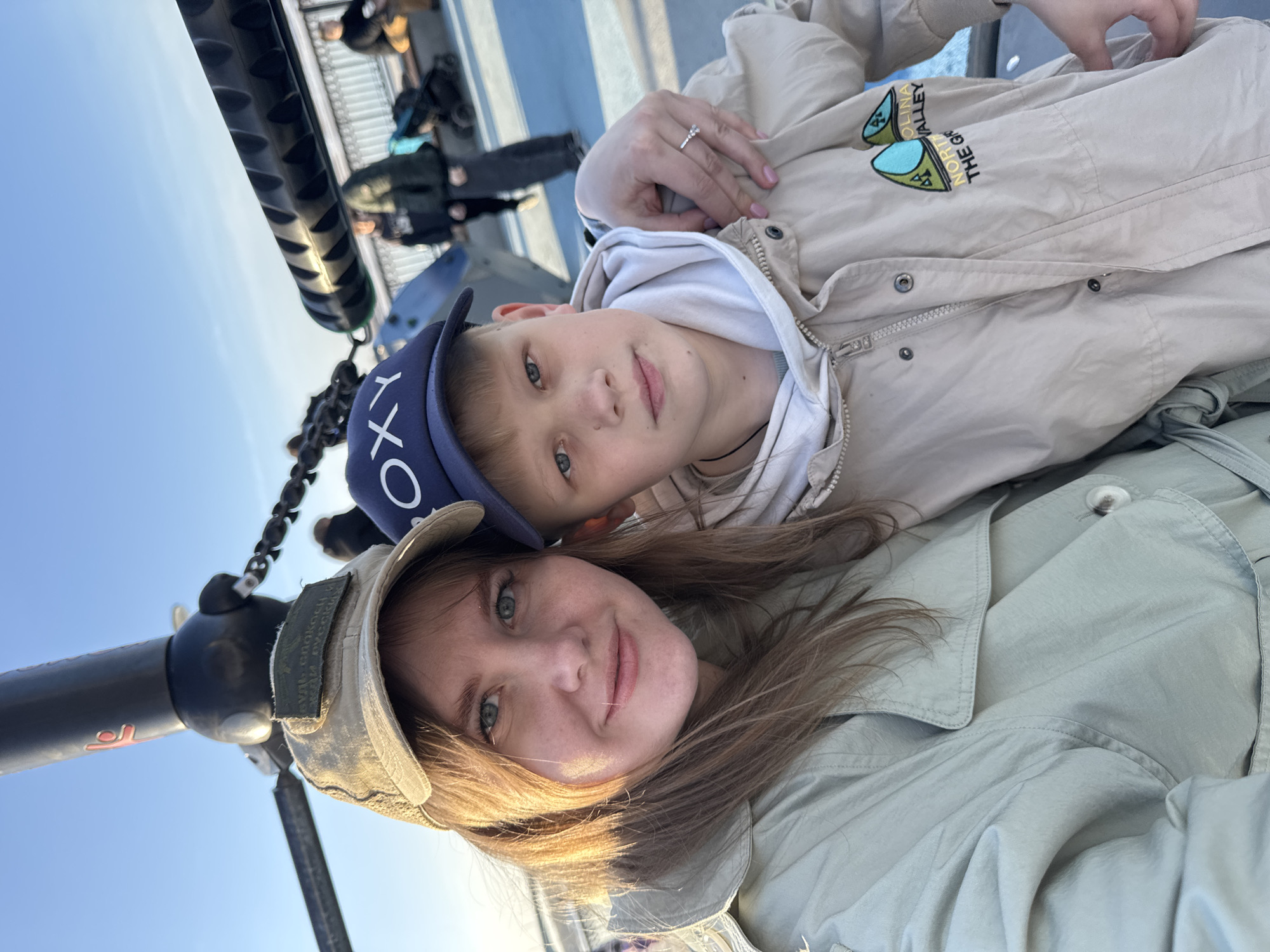 Here is a description of the image: A selfie taken by a woman with a boy in Perm, Russia. The woman is wearing a light green military-style cap and a light green trench coat. The boy is wearing a navy blue baseball cap and a cream-colored jacket with an embroidered logo. The woman is smiling at the camera while the boy is looking at the camera with a neutral expression. They are standing next to a swing set at a park overlooking the Kama river. In the background are other people. The swing set is black and has a red emblem.