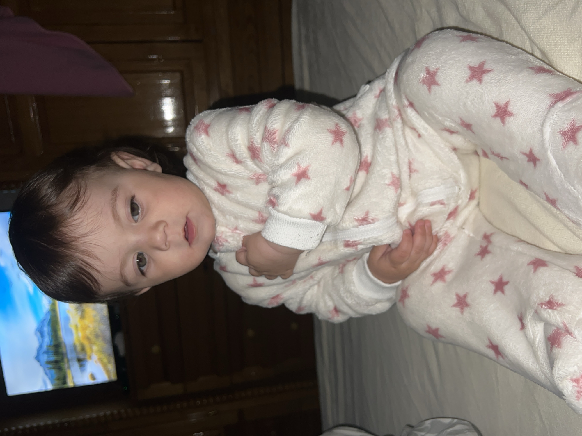 A baby wearing a white onesie with pink stars lies on a white bed, with a television screen in the background displaying an image of a mountainous landscape. The location is Elena, Bulgaria.