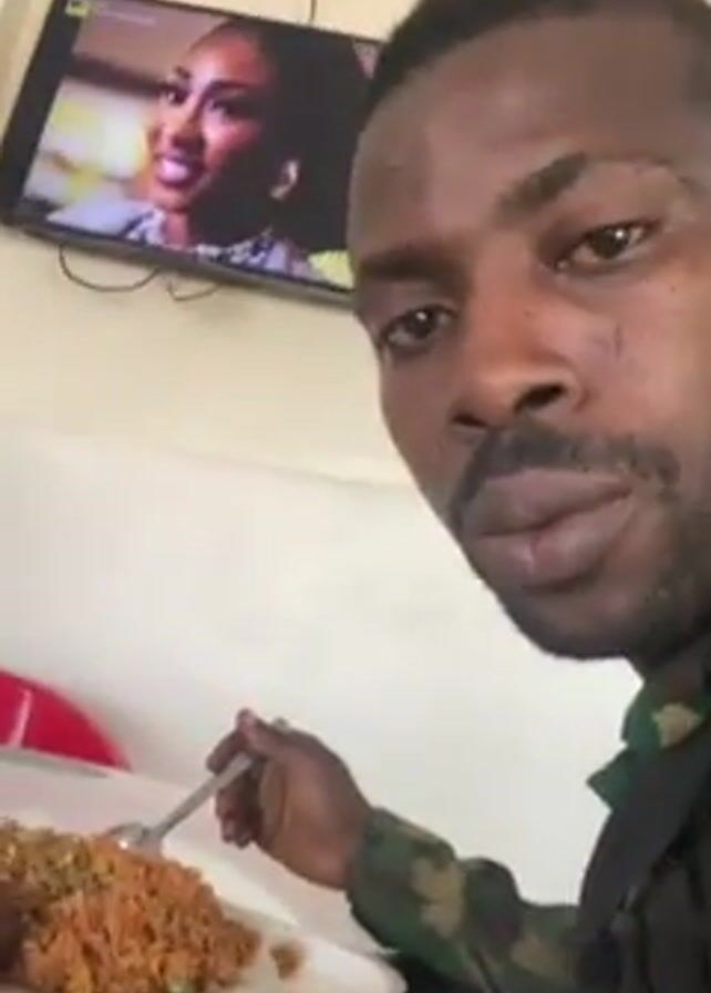 A man wearing camouflage clothing is sitting at a red-and-white table, eating a meal of rice and fried plantains. He is holding a spoon and looking directly at the camera, while there is a television showing a woman’s face in the background. The plate of food is on a white tray. A black face mask and a silver knife are visible next to the plate on the tray.