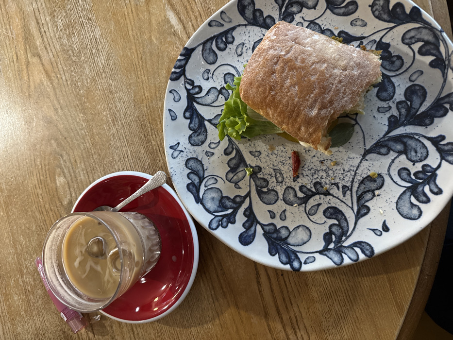 The image depicts an overhead view of a partially consumed meal and drink on a light-colored wooden table