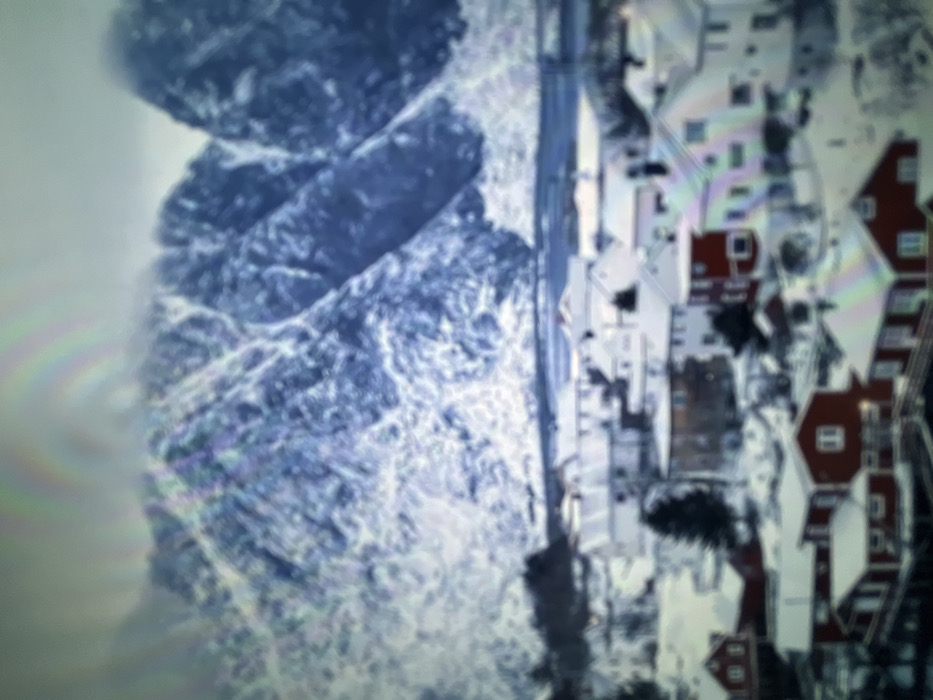 The image displays a mountainous landscape juxtaposed with a town. The mountain range is rugged and snow-covered. Adjacent to the mountain is a linear feature, possibly a road or path, running parallel to the base. The town comprises buildings with red roofs, suggesting a distinct architectural style. The entire scene is blurred, creating a somewhat abstract and indistinct representation of the natural and built environments. The color palette is dominated by whites, grays, and blues, highlighting the snowy and possibly cold environment.