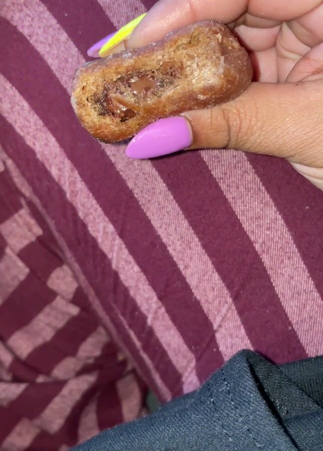 A hand with brightly colored nails holds a half-eaten pastry, revealing a chocolate filling. The pastry is golden brown and appears to be fried or baked. The background features maroon and white striped fabric, likely clothing or bedding, with a glimpse of dark blue material at the bottom.
