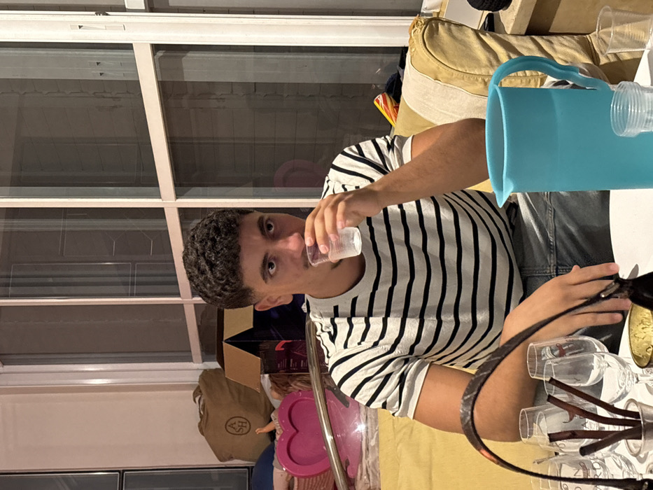 A young adult male, appearing to be in his early twenties, is seated on a yellow upholstered sofa in an indoor setting. He has short, dark, curly hair and is wearing a short-sleeved, horizontally striped black and white t-shirt with light-wash blue jeans. He holds a small, clear plastic cup to his mouth, containing a clear liquid, and appears to be drinking from it. His gaze is directed slightly upwards and to his right. In the immediate foreground, a white table surface is visible, holding multiple empty stemmed glass goblets, some containing dark, thin, twig-like objects. One goblet shows partial text "DON GARDEN." Also on the table are a bright turquoise plastic pitcher, at least two additional small clear plastic cups, and a gold-colored object. A dark, possibly leather, handle is partially visible extending into the lower left of the frame. The background to the male's left features a cluttered area behind the sofa, including a large, light brown canvas bag with a circular "ASH" logo, an open cardboard box, and a pink heart-shaped object, situated in front of a multi-pane window or glass door. The background to his right shows more of this window/glass door structure. The lighting is artificial and relatively dim, consistent with an evening indoor scene. The environment suggests a casual residential or private gathering space. No specific visual markers are present in the image to pinpoint a precise location within Ramat Gan, Israel.