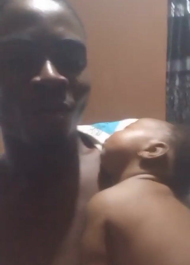 A person holds a sleeping baby in front of them. The person smiles and looks directly at the camera. The person appears to be indoors. There is a window with patterned curtains behind them, and a picture on the wall to their left. The baby is shirtless, and the person is also bare-chested.