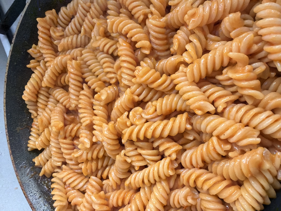The image displays a close-up, top-down view of fusilli pasta completely filling a dark, circular frying pan or skillet. The spiral-shaped pasta is uniformly coated in a light orange-pink, creamy sauce, exhibiting a slightly glossy texture. Individual pasta pieces show consistent coverage without significant pooling of sauce. A faint, lighter-colored surface, possibly a stovetop or countertop, is visible behind the pan's top edge. No individuals or specific actions are depicted. The scene is located in a kitchen in Tel Aviv, Israel.