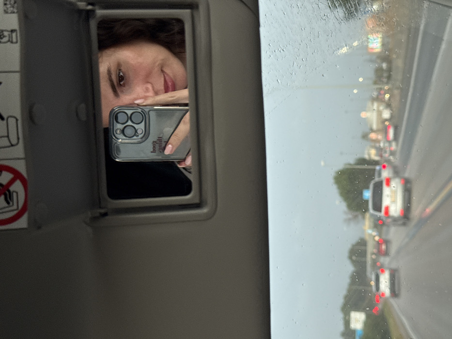 The image captures a scene from within a vehicle on a major multi-lane highway within or immediately bordering the city of Palma de Mallorca, Spain, consistent with an arterial road. The sky is overcast, and the vehicle's windshield is speckled with raindrops. In the upper half of the frame, the vehicle's gray passenger sun visor is deployed, revealing a rectangular vanity mirror. Reflected in this mirror is the right side of an adult female's face, featuring dark wavy hair, fair skin, and a dark eye. She is holding a gray smartphone, identified as an iPhone with a triple camera array, in her left hand, positioned to capture her reflection. The phone case bears mirror-reversed text, likely reading "Good Things." Her left thumb is visible on the phone, and her left index finger partially obscures her face. Above the mirror, a red circular warning symbol, depicting a car seat with a diagonal line, is visible on the sun visor. The lower half of the image, viewed through the rain-dotted windshield, shows several vehicles traveling ahead on a wet highway. Multiple cars, predominantly light-colored, have their red taillights illuminated. The scene beyond the road is out of focus, revealing blurred streetlights, distant trees, and indistinct commercial or industrial structures under a gray sky.