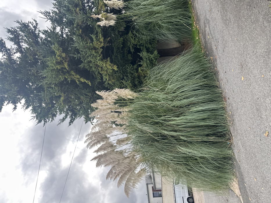The image depicts an outdoor scene in Saulx-les-Chartreux, France, under an overcast sky. The foreground features a dark grey asphalt road surface with scattered brown leaves, sloping gently upwards from left to right. Dominating the midground is a large clump of pampas grass (Cortaderia selloana) with long, arching green leaves and numerous light beige, feathery plumes extending upwards. Behind this, to the right, a tall, dark green coniferous tree, possibly a fir or spruce, occupies a significant portion of the frame, with its dark brown trunk visible at the base. A smaller cluster of pampas grass is visible to the right of the tree's trunk. In the background on the left, a light-colored building with a dark roofline and a dark-framed window is partially visible, behind which a white panel van is parked on a paved surface. Two dark utility wires traverse the upper left sky. No individuals are present in the scene.