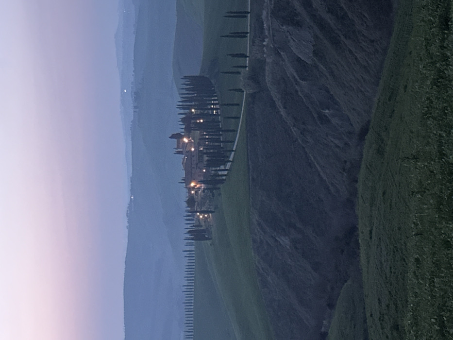 The image depicts a panoramic view of the Podere Belvedere farm complex, located in the rolling hills near Asciano, Siena, Italy. The scene is observed at twilight, characterized by a gradient sky transitioning from a soft lavender-pink at the top to a muted blue-grey towards the horizon. In the midground, a cluster of traditional Tuscan buildings, likely a farm or villa, is situated atop a prominent green hill. These buildings are illuminated by multiple warm, artificial lights, casting a yellowish glow. A distinctive, winding dirt or gravel road, bordered by an extensive double row of tall, slender cypress trees, ascends the hill and leads directly to the illuminated complex. The road forms a prominent S-curve pattern. To the left of the central complex, another straight line of numerous cypress trees is visible along a distant ridgeline. The foreground consists of a deeply incised valley or ravine with steep, eroded slopes in various shades of dark grey and blue, partially covered by sparse green vegetation. Beyond this ravine, a field of green grass occupies the immediate foreground. In the background, successive layers of hazy, undulating hills in muted blue tones extend to the distant horizon. No individuals or active subjects are discernible within the frame.
