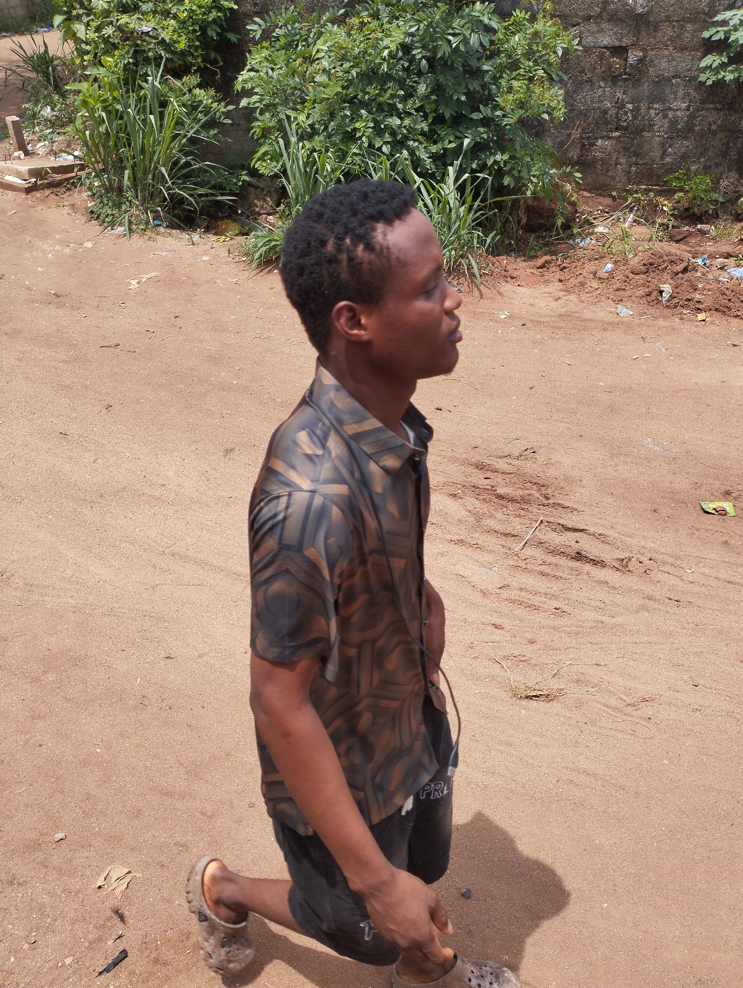 A young, slender male stands on a dirt path in Ihiagwa, Nigeria. He has short, dark hair and is wearing a patterned, short-sleeved shirt, dark shorts, and light-colored sandals. He is looking to the right. The background includes green foliage and a concrete wall. The path appears sandy and contains scattered debris.
