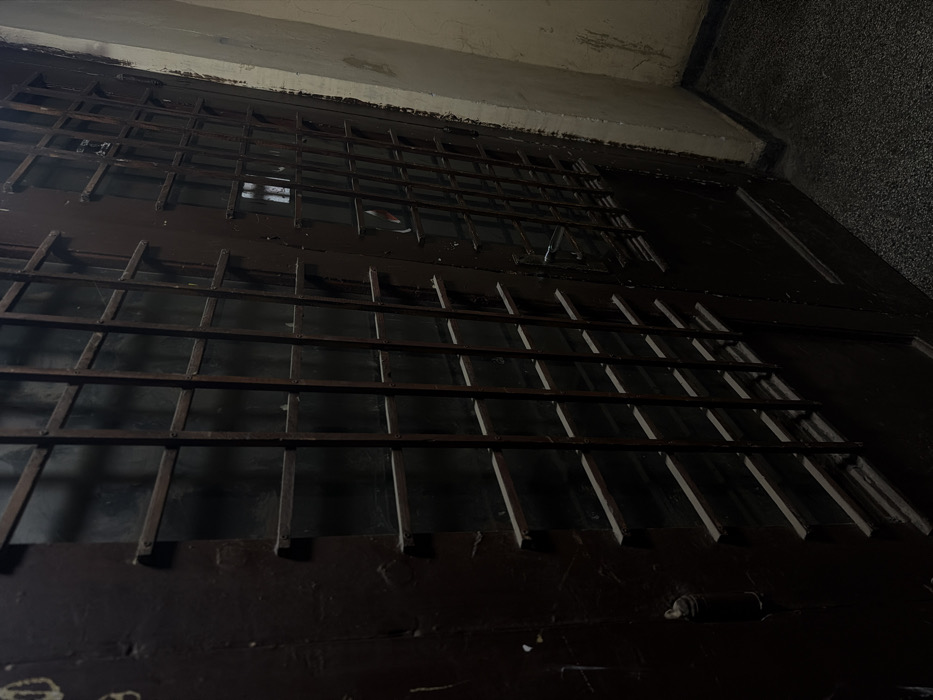 The image depicts a dimly lit indoor entryway in Sofia, Bulgaria, featuring a set of dark brown double doors. Each door panel is equipped with a grid of horizontal and vertical dark metal bars, covering transparent or semi-transparent sections. The doors exhibit wear, including chipped paint and surface abrasions. A dark, lever-style door handle is visible on the right door panel. To the right of the doors, a light-colored, possibly beige, wall shows signs of staining and deterioration. The floor is a dark, speckled surface, likely terrazzo or concrete, meeting the wall at a dark baseboard. No individuals are present. The scene conveys an aged, utilitarian environment.