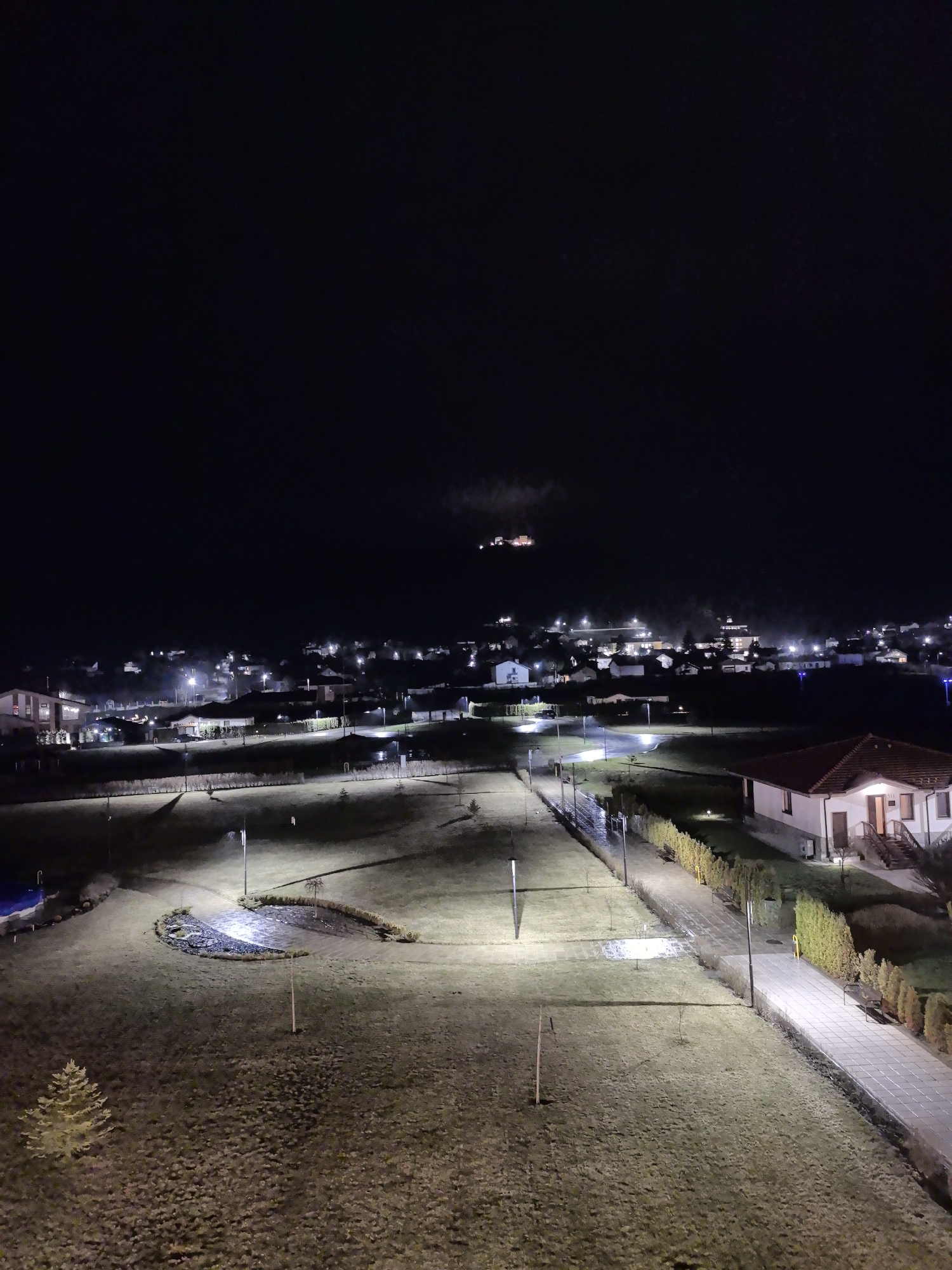 This image depicts an elevated nighttime view of a developed area within Belchin, Bulgaria. The foreground is dominated by extensive grassy terrains illuminated by numerous streetlights and ground lights. A small, light-colored conifer tree stands in the lower-left. Paved pathways are visible, including a prominent tiled walkway on the right edge, bordered by a dense, manicured evergreen hedge and several benches. To the right of this walkway, a single-story house with a reddish-brown tiled roof, light-colored walls, and an illuminated entrance with stairs is visible. In the upper-left of the foreground, a blue-covered object, likely a swimming pool, is partially discernible. The mid-ground transitions to a residential or village area characterized by a cluster of buildings with varying artificial lights, suggesting a settlement beyond the immediate complex. A faint haze or low-lying mist is visible above this area in sections. In the far background, positioned on a distant elevation slightly left of center, a large, well-lit historical or fortified structure, likely a fortress or castle, dominates the skyline against the dark night sky. No individuals, specific actions, or interactions are visible within the scene. The environment is clearly man-made and illuminated, indicating human habitation and infrastructure.