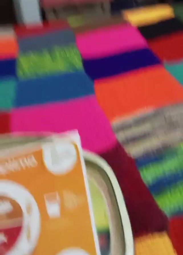Here is a detailed description of the video: The video shows a colorful patchwork blanket on a bed or a surface similar to a bed. The blanket is made up of squares in different vibrant colors such as red, pink, blue, green, orange, and a striped pattern. On top of the blanket, there is a silver tray with a document on it. The document appears to be a nutritional guide, featuring text and graphics related to dietary recommendations. The document is titled "El Plato Óptimo" (The Optimal Plate) and includes information about cereals, liquids, and other food groups. The background of the video reveals a cluttered room with a wardrobe or closet full of clothes. There are also boxes and other miscellaneous items visible. The camera angle is slightly tilted, suggesting that the person holding the camera is standing or sitting at a slightly higher position than the bed.