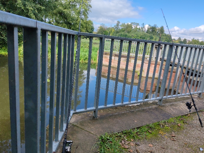 The image depicts a daytime scene at a lock on the Canal du Rhône au Rhin in Strasbourg, France. The perspective is from a concrete embankment overlooking the canal. In the immediate foreground, a grey concrete surface is visible, partially covered with sparse grass, moss, and scattered natural debris. A sturdy grey metal railing, composed of a horizontal top bar and numerous vertical rectangular bars, runs across the mid-ground, separating the embankment from the water. Two fishing rods are positioned on the concrete path, leaning against the railing. The fishing rod on the left has its reel visible near the bottom-left of the frame. A second fishing rod is situated on the right side, extending upwards and to the right, with its reel also visible near the bottom-right. The lines from these rods are cast into the calm canal water. The canal water, appearing dark green in some areas and reflecting a blue sky with white clouds in others, occupies the space behind the railing. On the far side of the canal, a substantial lock structure is visible. This structure is characterized by numerous vertical, reddish-brown rectangular segments, indicative of Vosges sandstone (grès des Vosges) masonry, forming part of the lock chamber or a similar water control system. The reflections of this reddish-brown structure are clearly visible in the water. Beyond the lock structure and the canal, a lush green landscape of trees and dense foliage forms the background under a bright, partly cloudy blue sky. No individuals are present in the scene.