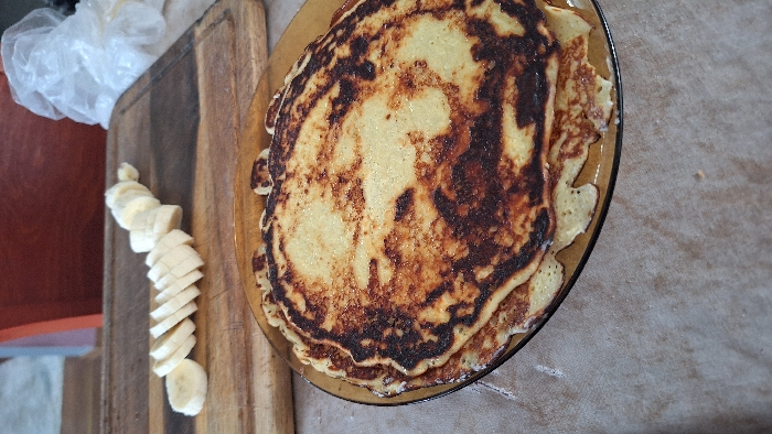 The scene depicts an indoor setting, likely a kitchen or dining area, located in the city of Unknown, Unknown. In the lower right foreground, a stack of multiple round, cooked pancakes with varied golden-brown and dark brown cooked surfaces rests on a transparent amber-tinted plate. To the upper left of the plate, approximately 12-15 circular slices of peeled banana are arranged in a curved line on a rectangular wooden cutting board. A crumpled, translucent white plastic bag is visible in the upper right background, behind the cutting board. The objects are situated on a textured, light brown surface, possibly a tablecloth or countertop. A blurred reddish-brown object, likely a piece of furniture, is partially visible in the far upper background.