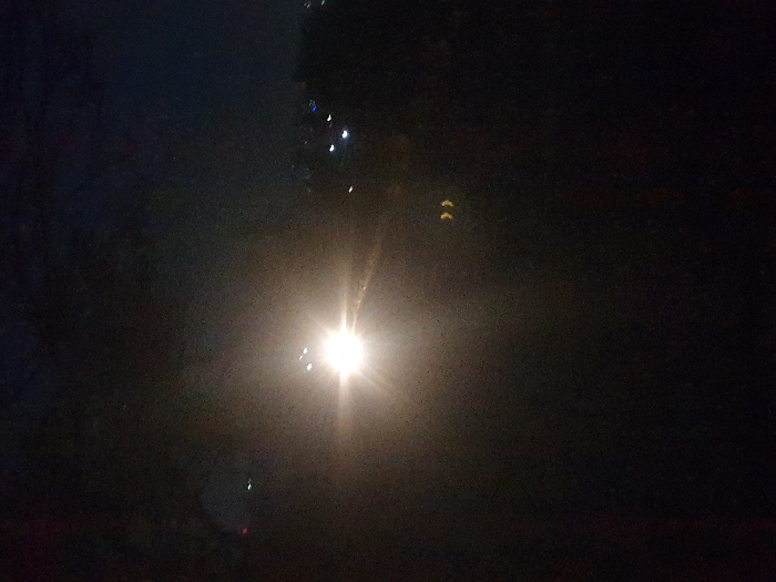 A central, bright light source dominates a very dark, grainy image. Dimmer, smaller points of light are scattered above and below the central light. The overall scene is obscured by heavy shadows and noise, with only a hint of texture suggesting a possible outdoor environment.