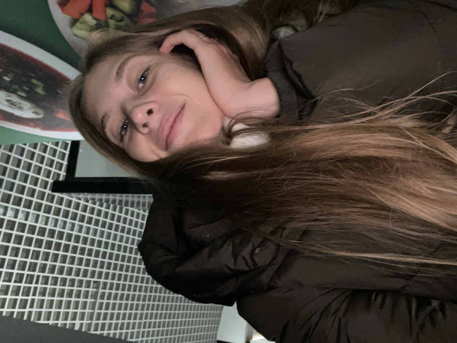 A female subject, appearing to be an adult with long, straight, light brown hair, is depicted from the chest up, positioned in the lower right portion of the frame and looking directly forward. She exhibits a faint, closed-mouth smile, with her right hand supporting her chin and cheek. She is dressed in a dark-colored, possibly olive green or black, puffer jacket, with a white inner garment visible at the neckline. The background reveals an indoor commercial environment, likely a cafe or restaurant in Lyubertsy, Russia. The upper left quadrant shows a white grid-patterned suspended ceiling. To the right, a large poster or mural with a green background is partially visible, featuring images of food items. One image prominently displays a bowl of red soup, consistent with borscht, topped with a white dollop, and another image below it shows a plate of sliced vegetables including cucumbers and tomatoes. The specific name or address of the establishment within Lyubertsy cannot be determined from the visual evidence.