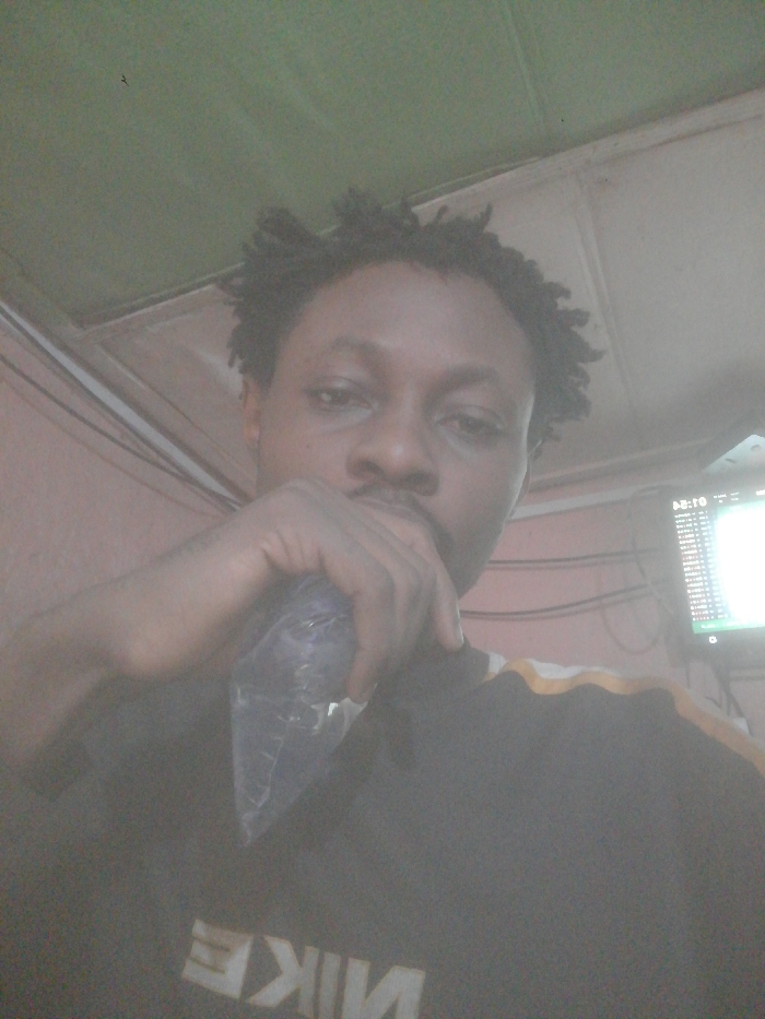 young adult male, of dark complexion with short, dark, textured hair, captured in a selfie or mirror image within an indoor setting in Zaria, Nigeria