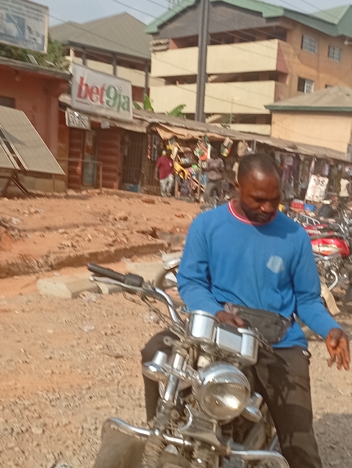 A man in a blue long-sleeved shirt and dark pants straddles a motorcycle. A fanny pack is around his waist. Behind him are several other motorcycles parked along a dirt road, and a line of small shops or stalls. A building with a "bet9ja" sign is visible in the background. The ground is bare and reddish-brown in color. Several other buildings are behind the man and shops.