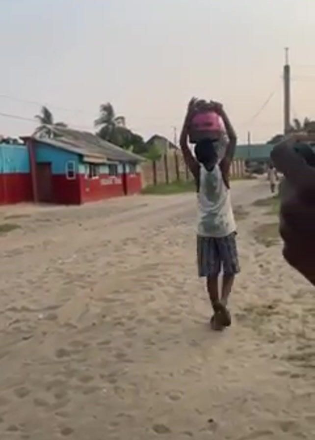A young person walks along a sandy street carrying a pink container on their head. The person is wearing a light-colored tank top, patterned shorts, and flip-flops. They are walking away from the camera, heading down a dirt road. On the left side of the road is a building with red and blue walls, and further down are other buildings and vegetation. The sky is overcast. A person’s hand with a phone is visible in the foreground, suggesting they are recording the person walking.