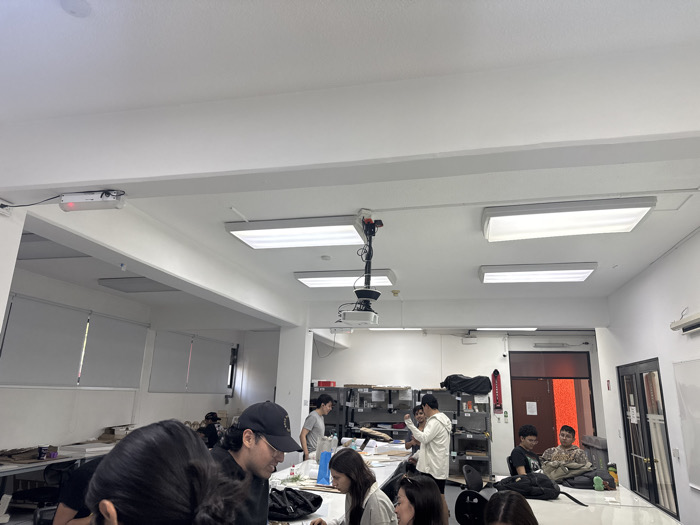The image depicts an indoor studio or classroom setting, located in San Andrés Cholula, Mexico. The room features white walls and a white ceiling, illuminated by multiple rectangular fluorescent light fixtures. Two projectors are mounted from the ceiling structure; one is positioned on a beam towards the left, displaying a red indicator light, and another larger projector is centrally suspended. On the left side, multiple windows are covered by white roller blinds. In the background, a reddish-orange door is visible, along with open shelving units containing various objects and supplies. Approximately ten individuals, predominantly young adults, are present. In the foreground, the back of a person's head with dark hair is visible, facing right. To their immediate right, a male wearing a black baseball cap and a dark shirt is seen looking down, seemingly at the surface of a large white table. Other individuals are distributed throughout the mid-ground and background, standing or seated around large white tables. Actions include observing materials on the tables, engaging in discussions, and operating personal devices. For instance, in the background-right, two males are seated at a table; one is looking down at a small electronic device. Objects on the tables include papers, bags, and other workspace items. A red object, possibly a bag or garment, is hanging near the reddish door. The overall environment suggests an active, collaborative, or study-focused workspace.