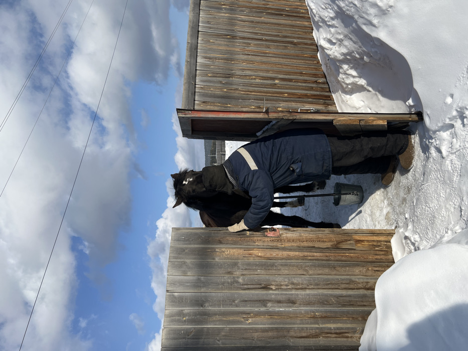 An outdoor scene in Невон, Russia, depicts an adult individual interacting with a dark horse during winter. The ground is uniformly covered in snow under a clear blue sky with scattered white clouds. An individual, dressed in a dark blue winter jacket with white stripes on the shoulders, black trousers, light brown felt boots, and a dark balaclava, stands within an open wooden gate composed of vertical planks. Their left arm is positioned around the horse's neck, while their right hand holds a long dark stick connected to a grey metal bucket resting on the snow near their feet. The horse, dark brown or black with a distinct white blaze on its forehead, faces the individual. A section of a wooden plank fence extends to the right of the open gate. Multiple parallel power lines are visible overhead against the sky. In the background, a snowy, open area leads to a distant treeline.