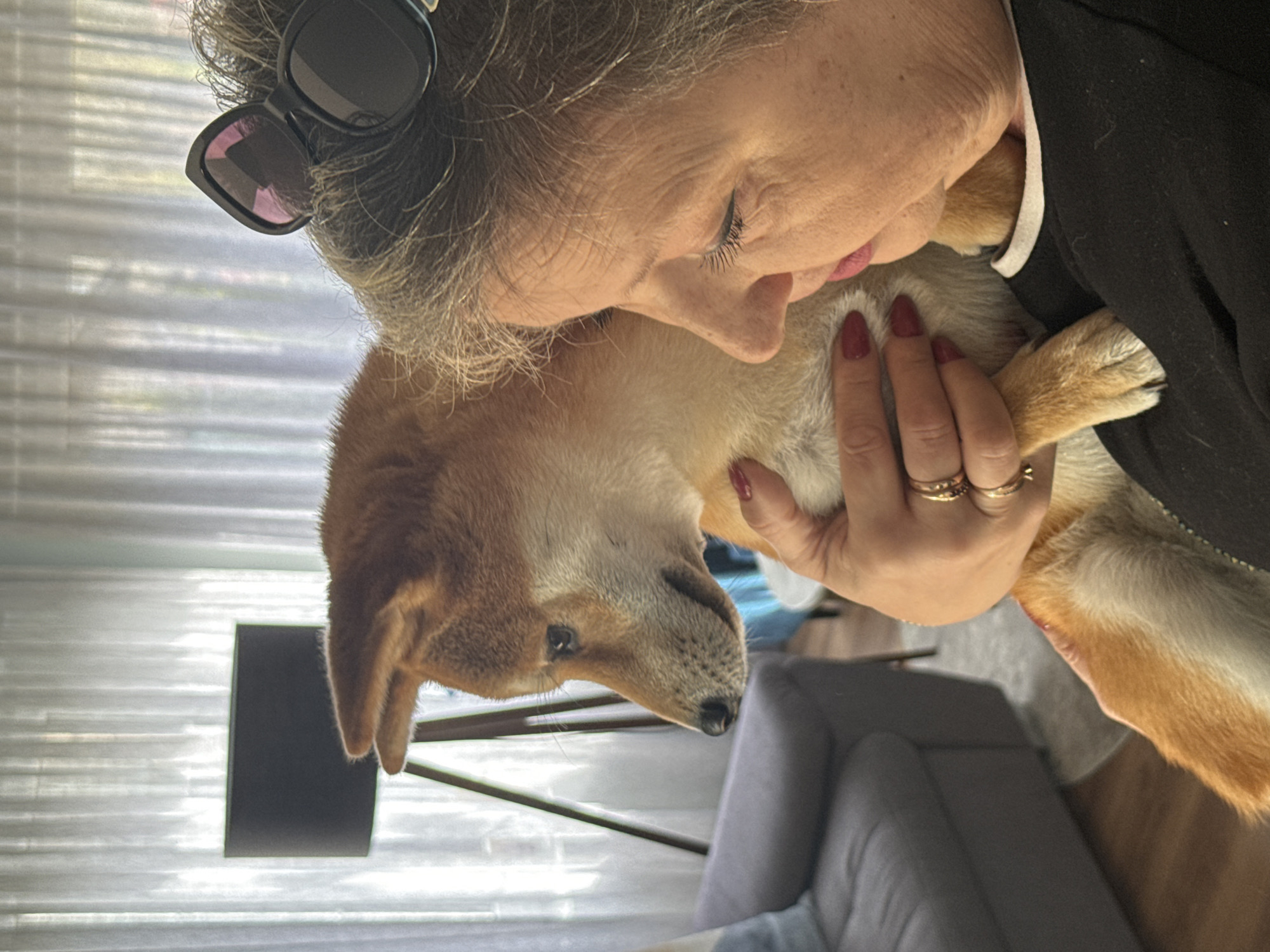 The scene depicts an indoor environment in Carnikava, Latvia, featuring an adult female holding a dog. The woman, positioned on the right side of the frame, has graying hair, with dark sunglasses perched on her head. She exhibits visible facial wrinkles, has red nail polish on her fingernails, and is wearing pink lipstick and a black top with a white collar. Her right arm is visible, holding the dog close to her body. Her eyes are closed or looking downwards, and her head is angled towards the dog's head. The dog, identifiable as a Shiba Inu breed, possesses tan/orange and white fur. It is held in an upright position, its head turned towards the left of the frame, looking slightly downwards. The background shows sheer white curtains covering a window or glass door, through which bright, diffuse light enters. A dark floor lamp with a black cylindrical shade and a tripod base stands in the mid-ground. To the left, a portion of a gray sofa or armchair is visible, adorned with a light blue throw pillow. The floor appears to be wooden, with a small, light-colored rug situated beneath the sofa area.