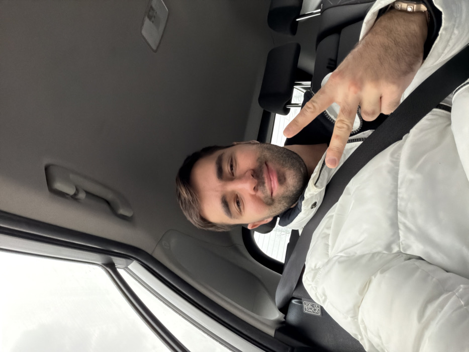 A man wearing a white puffer jacket and a seatbelt is posing for a selfie inside a car. He’s giving a peace sign with his right hand. He has short dark hair and a beard. The car's interior is gray, and part of the window and door frame are visible. He is wearing a watch on his wrist.