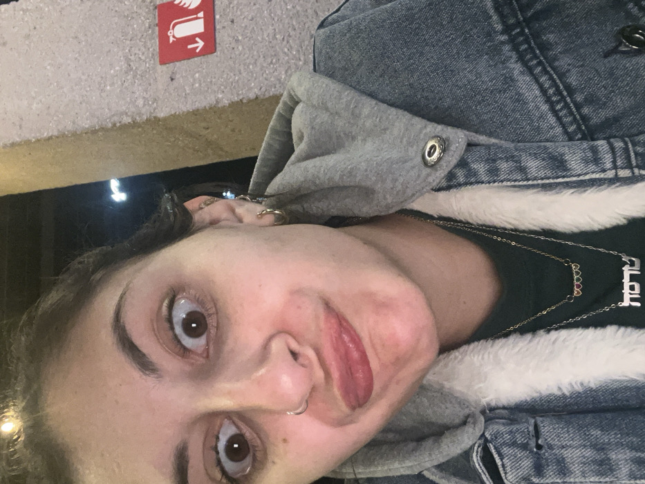 A woman with brown eyes and a nose ring sticks out her tongue. She is wearing a denim jacket with a grey hood and a fur lining. A silver necklace with the word "Malak" and another silver necklace with rainbow hearts hang around her neck. In the background is a concrete wall with a red sign depicting a fire extinguisher and an arrow.