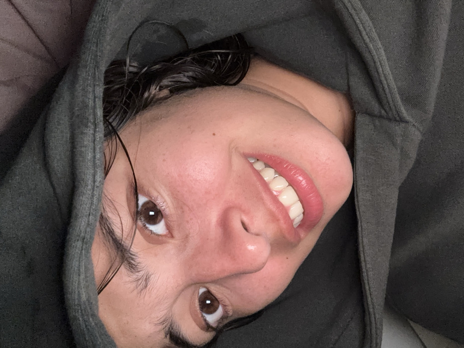 A close-up, upward-angled image depicts an individual's face, possibly a young adult, framed by a dark olive-green hooded garment. The face is centrally positioned and illuminated by what appears to be artificial light. The individual has medium-toned skin with a reddish undertone, visible small freckles on the nose and cheeks. Dark brown eyes with dilated pupils are visible, along with a thin line of dark eyeliner on the upper lids. Dark, full eyebrows are present. The individual is smiling, revealing a set of white, even upper teeth. The lips are full, glossy, and have a pinkish-red hue. Dark hair, appearing wet or styled, is visible on the right side of the face, extending from beneath the hood. The hooded garment, likely made of a soft fabric, constitutes the immediate background and frames the entire face. No other objects or environmental details are discernible. The scene is identified as being in the city of Komchén, Mexico; however, no specific visual elements within the image confirm this geographical context.