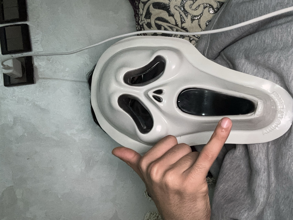 A person wears a white “Scream” mask while extending their middle finger. The mask has black eye and mouth openings. The person wears a gray long-sleeve shirt. A white cord runs across the top of the mask towards a black wall socket on a light gray textured wall. A patterned pillow appears behind the person's head. The person's hand has brown skin.