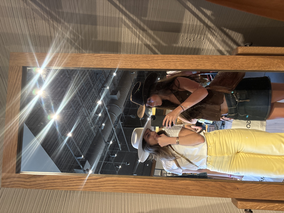 Two females are depicted in a mirror selfie taken inside a retail establishment in San Antonio, United States. The mirror features a light wooden frame. The individual on the left side of the reflection wears a light-colored wide-brimmed cowboy hat, a white t-shirt, and yellow wide-leg pants. She has a gold bracelet on her right wrist and her left hand is raised to her chin. The individual on the right side of the reflection wears a dark wide-brimmed cowboy hat, a dark sleeveless top, and a dark denim mini-skirt with a chain accessory near the waist. A brown, textured shoulder bag hangs from her right shoulder. She holds a dark-colored smartphone, pointed towards the mirror, actively capturing the image. Both individuals are looking towards the phone/mirror and smiling faintly. The background reflection reveals an industrial-style ceiling with exposed dark ductwork and numerous track lights, some causing distinct lens flares on the mirror surface. Additional hats are visible in the background reflection, implying a display within a store. The walls adjacent to the mirror exhibit a textured, ribbed pattern. A white shopping bag is partially visible on the floor near the left individual's feet.