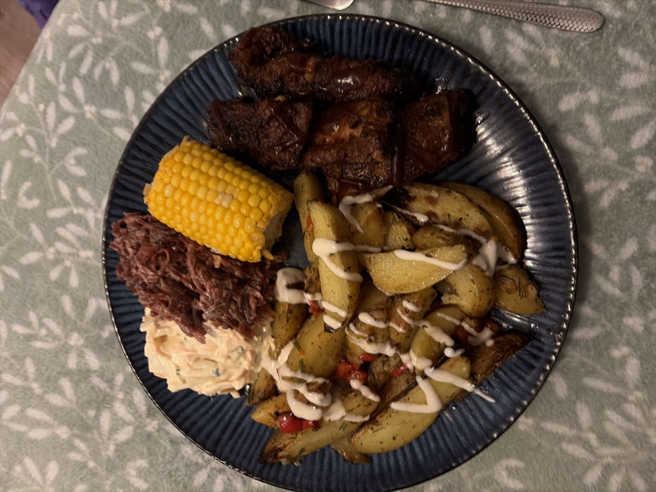 The image displays a single serving of a prepared meal on a dark blue, ridged circular plate, situated on a light green tablecloth with a subtle white leaf pattern. The plate holds multiple food items: roasted potato wedges, seasoned with herbs and red flakes, are piled on the lower-left and drizzled with a white creamy sauce. Adjacent to them on the upper-left, a portion of creamy coleslaw is present next to a mound of dark red, shredded food, possibly red cabbage slaw or pulled meat. Centered at the top of the plate is a half-cob of yellow corn. On the right side, several pieces of dark, glazed meat, consistent with barbecue ribs or chicken wings, are arranged. A silver-colored fork with a textured handle is partially visible along the right edge of the frame. The scene is consistent with an indoor dining setting, specified as being in New Forest, United Kingdom, though the image itself contains no explicit geographical markers. No individuals are present in the image.