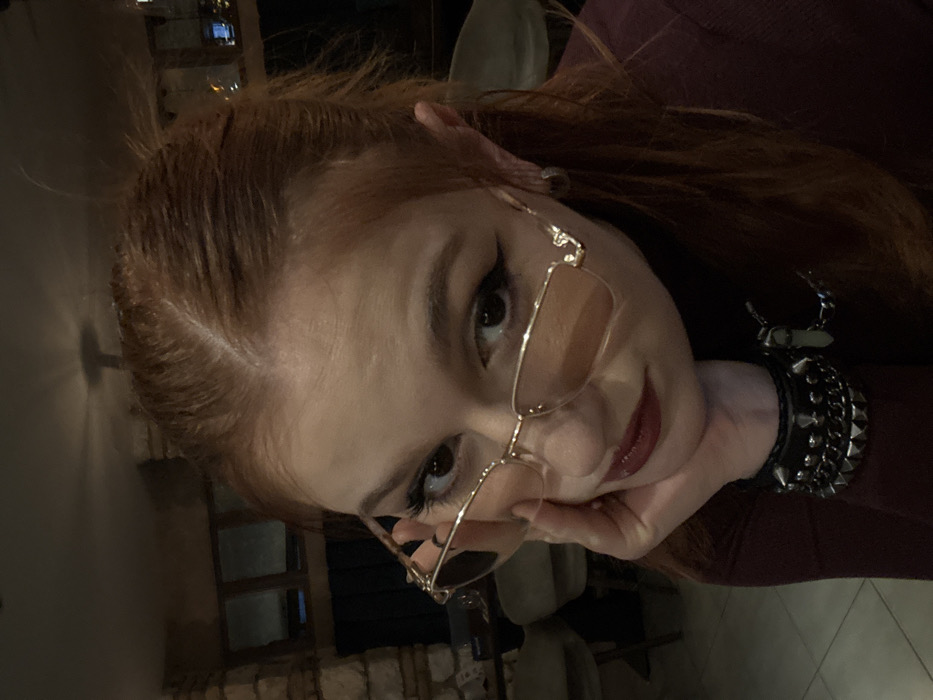 A female individual is depicted in a medium close-up, facing the camera with a slight head tilt. She possesses reddish-brown hair, styled away from her face, with a visible central part. Her eyes are dark brown, accented with winged black eyeliner, and she wears dark red lipstick with a glossy finish. She is wearing gold-framed glasses with light amber-tinted rectangular lenses, featuring a decorative element on the temples. Her right hand is positioned beneath her chin, with fingers slightly visible. She is dressed in a dark burgundy or maroon turtleneck garment. On her left wrist, she wears multiple black leather bracelets adorned with silver-colored studs, chains, and a padlock-shaped charm. A small hoop earring is visible on her right earlobe. The background is an interior setting, dimly lit with warm lighting, suggesting a restaurant or bar environment. To the left, a wall constructed of irregular stone blocks or textured material is visible. Further back, out-of-focus elements include upholstered chairs with light-colored backs and dark tabletops. A ceiling fixture, possibly a fan or light, is partially visible at the top of the frame. The specific location within the city of Varna, Bulgaria, cannot be determined from the visual information provided in the image.