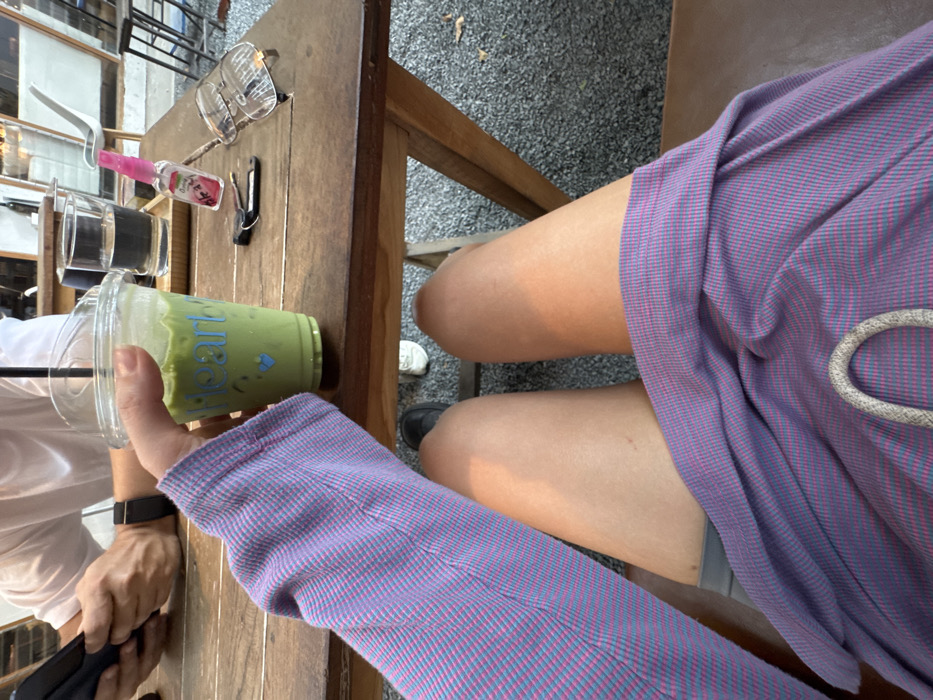 The scene depicts a first-person, downward view from a seated position at an outdoor or semi-outdoor cafe, likely "Hearty Coffee & Bakery" or "Hearty Cafe," located within Chiang Mai City Municipality, Thailand. The primary subject's bare thighs and a purple garment with pink horizontal stripes are visible, along with a light-colored strap across the lap. The subject's hand holds a clear plastic cup containing an iced green beverage, branded "Heartly" with a blue heart logo. Across the wooden slatted table, a second individual is partially visible, wearing a white shirt and holding a dark smartphone; a dark wristband is present on their left wrist. Other items on the table include a clear glass of water, a small clear spray bottle with pink liquid (likely hand sanitizer), a set of keys, and clear-framed eyeglasses. The ground beneath the table is covered with grey gravel. The background shows blurred elements of the cafe's outdoor setting, including glass and metal structures, under natural daylight.