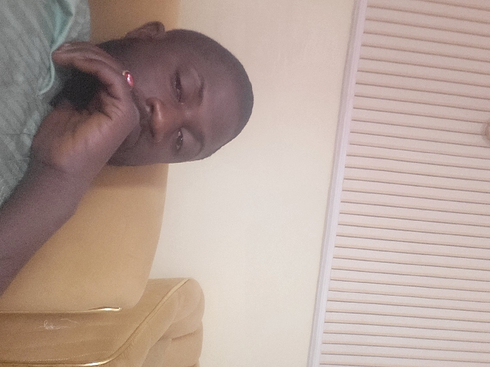 This is an indoor scene located in the city of Babawa, Nigeria. An adult male with dark skin is depicted in a medium close-up, occupying the lower left and center portions of the frame. He is seated on what appears to be a tan or gold upholstered sofa, visible on the right side and beneath him. His right hand is raised, with his chin resting on his knuckles, partially obscuring his mouth. A red ring is visible on his right pinky finger. He is wearing a light green, possibly patterned, shirt. His gaze is directed towards the camera. The background consists of a plain light-colored wall above the sofa, topped by a ceiling featuring light-colored vertical paneling. The lighting suggests an interior environment.