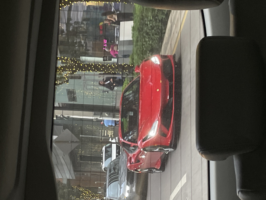 A bright red Ferrari is parked along a curb, reflecting a building façade adorned with festive lights. Several people are visible in the reflection, along with other vehicles parked behind the Ferrari. The image is taken from inside another vehicle, with parts of the interior visible on the right and left edges of the frame. The scene appears to be in an urban area with modern architecture.
