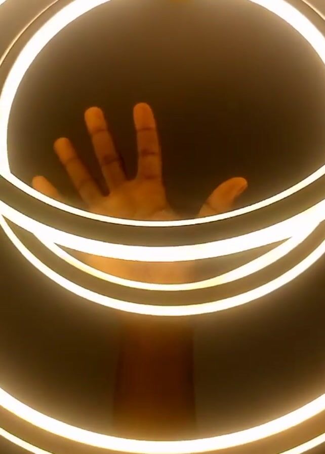 A hand is held up inside a ring light. The ring light has three concentric rings of light. The hand is dark-skinned and palm is facing the viewer. The background is dark. The arm extends down out of the frame.