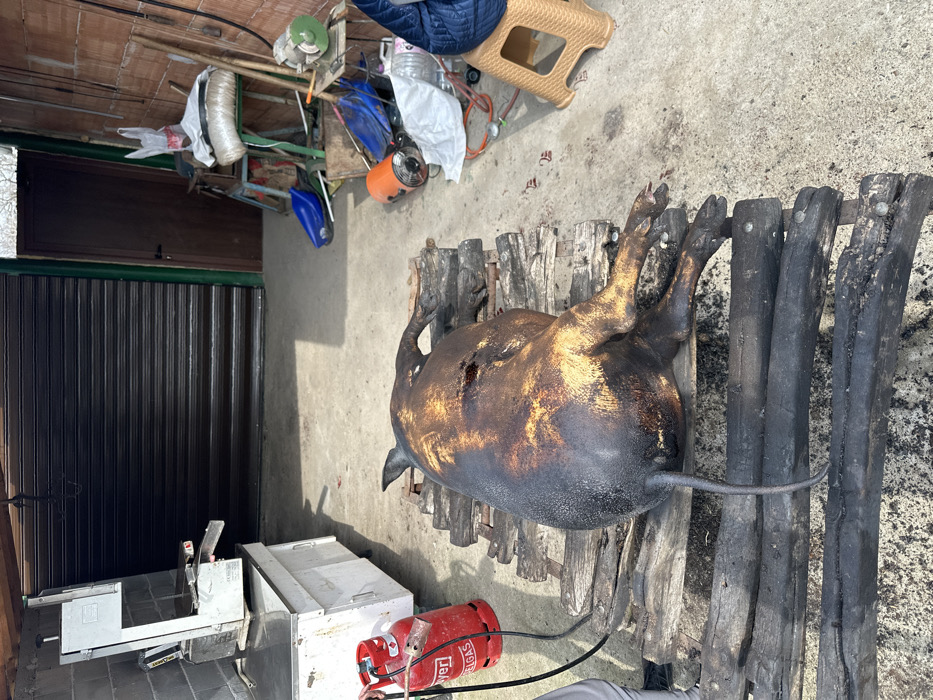 - "A large, deceased pig is positioned supine on a charred wooden grate on a concrete floor under an open-fronted shelter in Valchitran, Bulgaria" by FM-JTPw42, licensed under CC BY 4.0