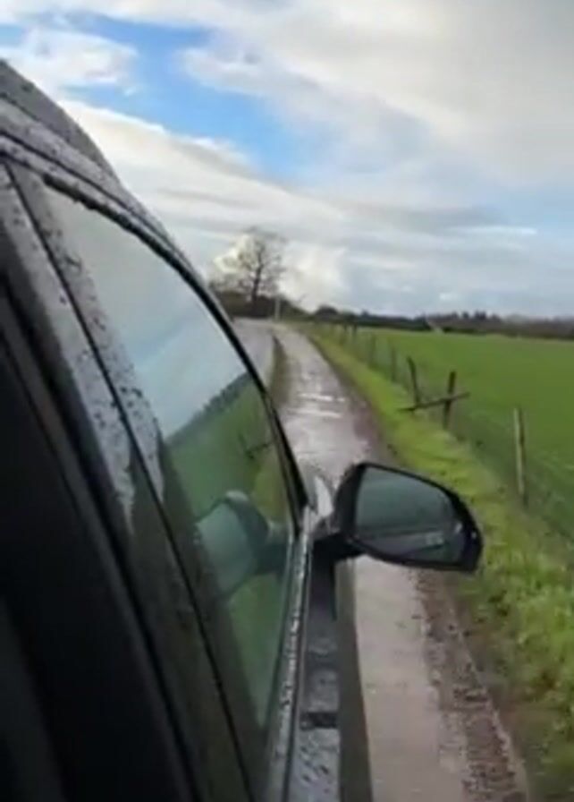 From the perspective of someone inside a moving, possibly black, car, the video shows a rainy day scene as the vehicle travels down a narrow, muddy, unpaved road