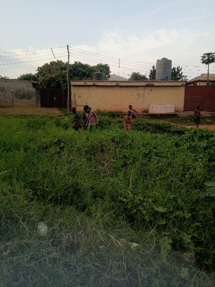 A group of children are wading through a patch of tall, overgrown green grass. Behind them stands a long, low building with a beige wall and a rust-colored gate on each end. Two water tanks sit atop the building, partially obscured by trees. Power lines stretch across the sky. The sky is light blue with some clouds. A trash bag is visible in the lower left corner.