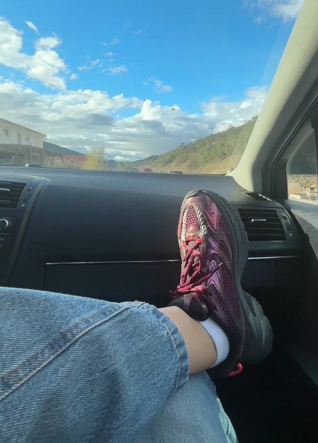 person in the passenger seat of a car, with their leg stretched out and foot resting on the dashboard. The person is wearing blue jeans, white socks, and a burgundy and black sneaker. The background shows a sunny day with a blue sky, white clouds, mountains, and buildings. The car is moving down the road.